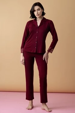 Poem długa piżama na guziki z koronką – czerwone wino